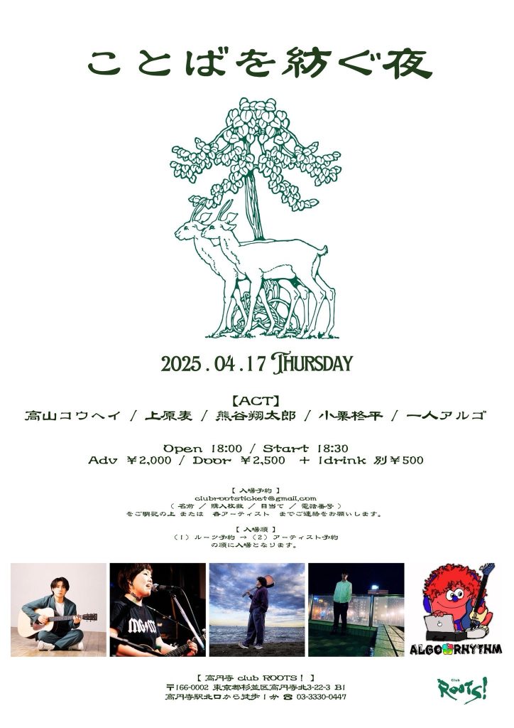 出演:上原麦 / 熊谷翔太郎 / 小栗柊平 / 一人アルゴ / 高山コウヘイ(出番18:30~)
