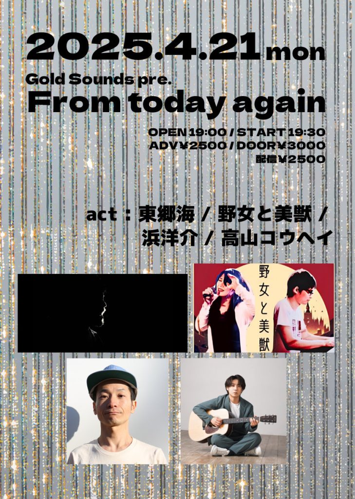 出演 : 東郷海 / 野女と美獣 / 浜洋介 / 高山コウヘイ(出番19:30~)